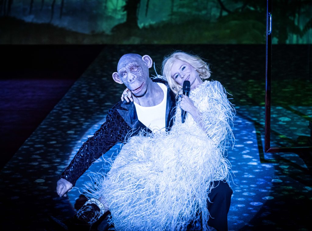 Bohaterką spektaklu jest jednak Costello – we wspomnianych powyżej sześciu kreacjach aktorskich. Pierwszą z nich tworzy Jadwiga Jankowska-Cieślak. W tej części przyćmiewa ją jednak syn John grany przez Bartosza Gelnera. Ani wykład pisarki w Williamstown, ani wywiad, jakiego udziela Susan Moebius (Magdalena Popławska) nie przykuwają uwagi w takim stopniu, jak krótki, płomienny romans między Johnem a Susan. Podglądamy tę grę w uwodzenie trochę jak w lustrzanym odbiciu – aktorzy siedzą tyłem do widowni, a to, co się między nimi wydarza, pozwala śledzić kamera przenosząca ich relację na duży ekran, w powiększeniu. Wydaje się, że nic nie umyka naszej uwadze: oto wytrawna uwodzicielka prowadząca literackie śledztwo zarzuca sidła na Johna, który jako opiekun towarzyszy matce w zawodowej podróży. Susan traktuje Johna nieco instrumentalnie – tak naprawdę interesuje ją Elizabeth, John ma być furtką do jej tajemnicy – i wydaje się, że dopina swego. Ale sprawa nie jest wcale tak ewidentna, tak jak nie jest wcale ewidentne to, kto nad kim sprawuje opiekę w tej matczyno-synowskiej relacji. Kto opowiada nam ten romans? Kto reżyseruje tę sytuację? Czy to przypadkiem nie Costello, która przed laty „wypuściła Marion Bloom na ulice Dublina”, teraz wypuszcza Johna prosto w ramiona Susan? I robi to tak sprawnie, jakby kierowała nie żywymi, ale literackimi postaciami. Elizabeth Jankowskiej-Cieślak jest znużona odpowiadaniem na wciąż te same pytania, koniecznością uczestniczenia w wykładach i debatach, ożywia ją dopiero iskra przebiegająca między synem a Susan, co zdradza błysk oka, leciutki uśmiech. Jednocześnie to ona też uwalnia innego dżina z butelki – uwięzionego w Kafkowskiej narracji szympansa, pozwalając mu hasać w przestrzeniach sal wykładowych, eleganckich hoteli, centrów konferencyjnych, na pokładzie luksusowego statku. Grany przez Chyrę szympans staje się bytem pośrednim, kimś pomiędzy człowiekiem a zwierzęciem. Z klasą nosi garnitur i zachowuje się jak rewers postaci performera w The Square Rubena Östlunda, który tak głęboko wszedł w rolę agresywnego zwierzęcia, że zrujnował całą imprezę, sprawiając, że goście muzeum uciekali w popłochu. Elizabeth w ślad za Kafką powołuje do życia małpę ucywilizowaną, wieszcząc koniec realizmu, przełamuje granicę między fikcją a rzeczywistością.